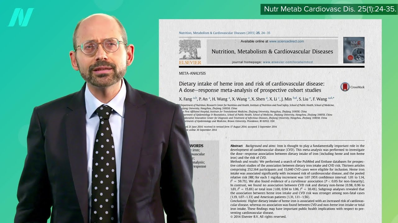 Притеснението, повдигнато в редакционната страница, например, е че по-високият прием на хем е свързан с повишен риск от развитие на диабет тип 2. Но не само диабет, убиец номер 7 в САЩ, по-високият прием на хем желязо е свързан с повишен риск от сърдечно-съдово заболяване също така, убийци номер 1, 4 и 13: сърдечно заболяване, инсулт и високо кръвно налягане. Но след като хемът се съдържа най-вече в месото, приемът на хем може просто да бъде показател за прием на месо. Същото е с диабета: 3 мета анализа, публикувани към днешна дата, и всички те съобщават за същата връзка. Но има много причини, поради които месото може да увеличава риска от диабет, като крайните продукти на гликацията, произведени, когато животинските продукти се пекат, варят, гриловат, пържат или се прави барбекю. И откъде знаем, че хемът не е просто някой невинен страничен наблюдател?